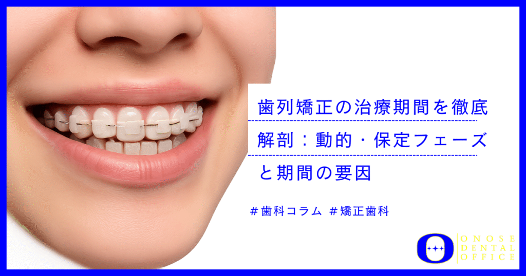 矯正治療の総期間は、歯を動かす期間、動かした歯を固定する期間、そして必要に応じて成長を待つ期間の3つのフェーズに分けられます。